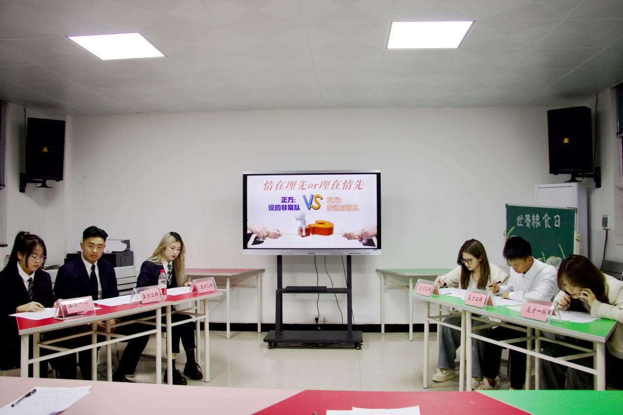 此次辩论赛共分为开篇立论、攻辩阶段、自由辩论和总结陈词四个环节。在开篇立论环节“说的非常队”和“我说对就队”就“理在情先”还是“情在理先”表明各自立场。正方立足于“情在理先”观点,在攻辩阶段强势发问,反方也依据社会生活案例,巧妙反击。在自由辩论环节,正方反方你攻我守,唇枪舌战,场面一度十分紧张,将辩论赛气氛推向高潮。最后,本次院级比赛向仲钦、李琳、金佳妮三位选手夺取胜利,成功晋级校级比赛。