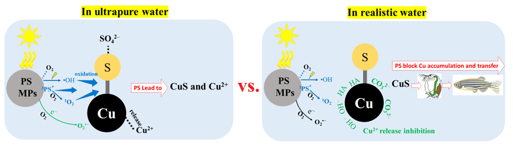 成果1:聚苯乙烯微塑料(PS MPs)能显著促进CuS颗粒的光氧化溶解,并通过Cu2+的释放增加了CuS颗粒的水生毒性效应。同时,在天然水环境中(丹江口水库水样),PS MPs介导下CuS颗粒能在一定程度上缓解Cu在大型溞-斑马鱼食物链中的传递。本研究丰富了PS MPs在食物链风险传递上的认知。