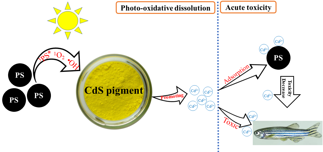 成果2:镉黄涂料因其显著的化学稳定性,常作为工业原料与添加剂被广泛地施加到我们的日常生活与生产中,进而会不可避免的进入到水环境。同在水环境中的PS MPs在自身光老化过程中,会通过表面产生的活性物质1O2、•OH和3PS*等诱发镉黄涂料的光氧化溶解,并促使强毒性物质镉离子的溶出与释放。最终,环境浓度的PS MPs即可破坏镉黄涂料的化学稳定性,并显著增加镉黄涂料 对斑马鱼的毒性效应。