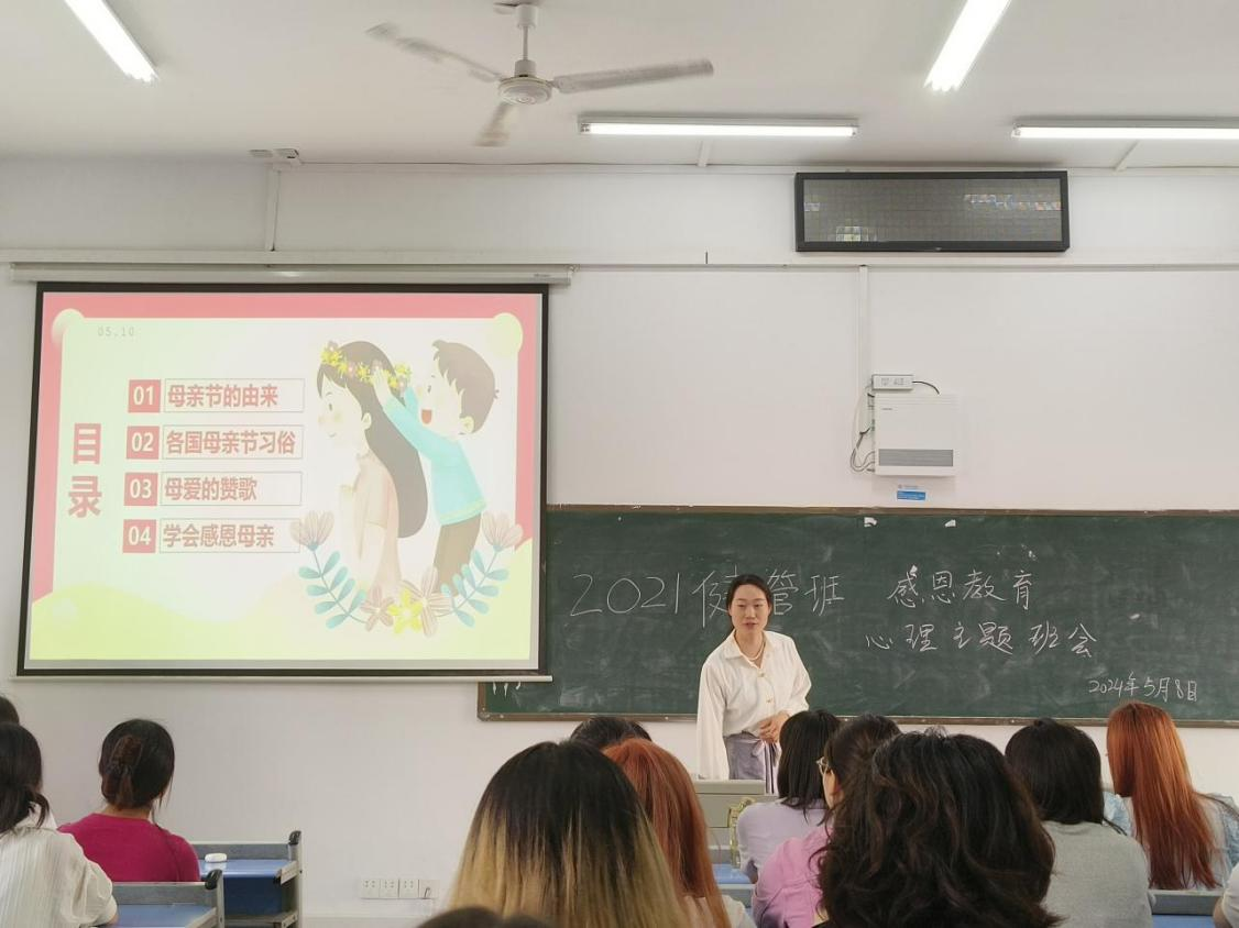 本网讯(通讯员 冯楠琦)为弘扬中华民族传统美德,培育和践行社会主义核心价值观,在母亲节来临之际,2021级健康服务与管理班级开展了“以爱之名,致敬母亲”的心理主题班会。本次班会由辅导员王晶艳主持、学院学生工作办公室副主任石中玉参加活动。