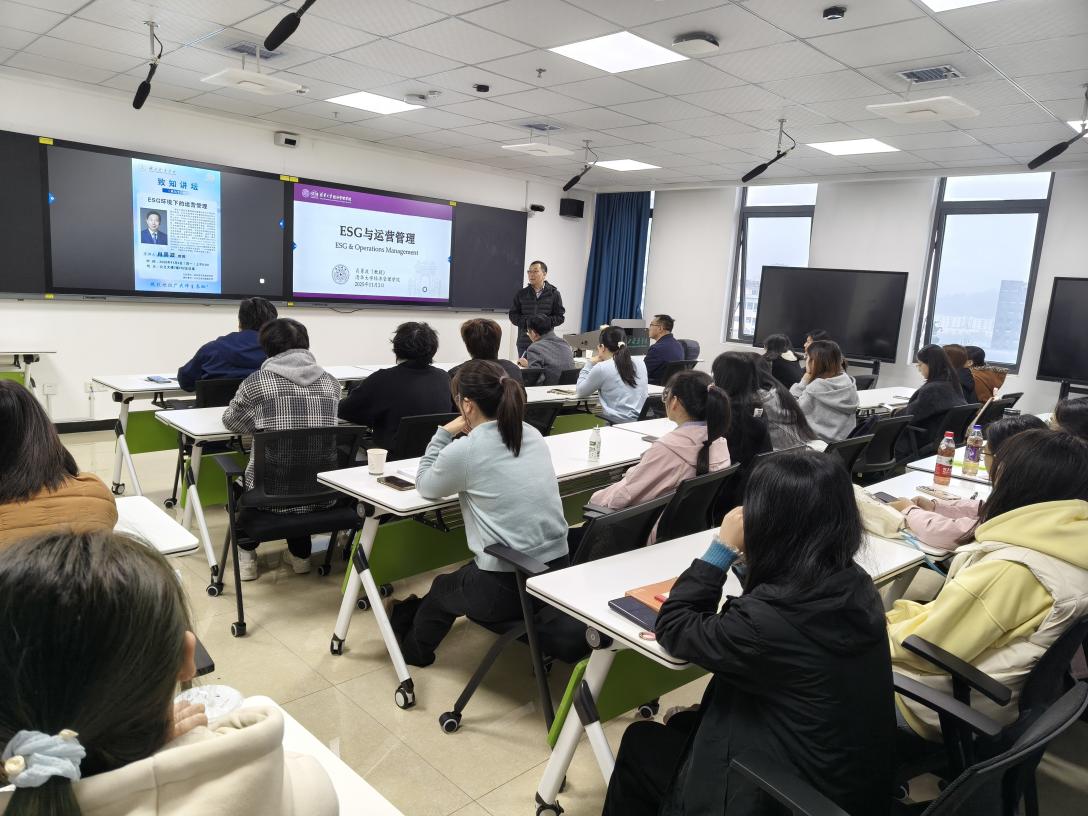 讲座中,肖教授以人类发展面临的生态与环境挑战为切入点,自然引入ESG 概念,系统梳理环境、社会、治理三大维度的范畴界定与国内发展脉络。他结合安踏“1+3+5”碳中和规划、溢达集团“无水染色”技术创新、胖东来员工福利体系构建等典型案例,深入阐释了企业践行ESG的外生驱动、内生需求以及运营战略调整、数字化赋能等落地路径;同时分享了其团队在ESG与供应链协同、平台定价策略等领域的研究成果,为在座师生搭建了贯通学术理论与商业实践的桥梁。